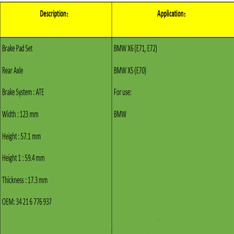 Descriere : Set placute frana / punte spate / Sistem frana: ATE / latime: 123 mm / inaltime: 57,1 mm / inaltime 1: 59,4 mm / grosime: 17,3 mm / OEM: 34 21 6 776 937